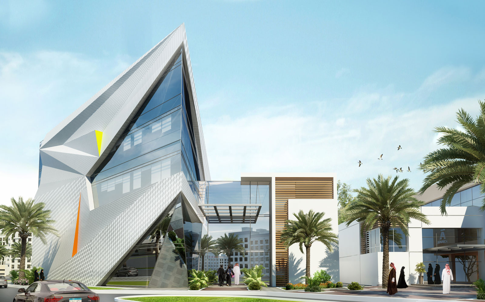 A modern mixed-use building with two interconnected, angular structures. The facade combines glass panels for ample natural light and beige cladding for visual contrast and stability. Designed for a variety of uses, the building features both office spaces and other commercial functions, connected by a central atrium that serves as