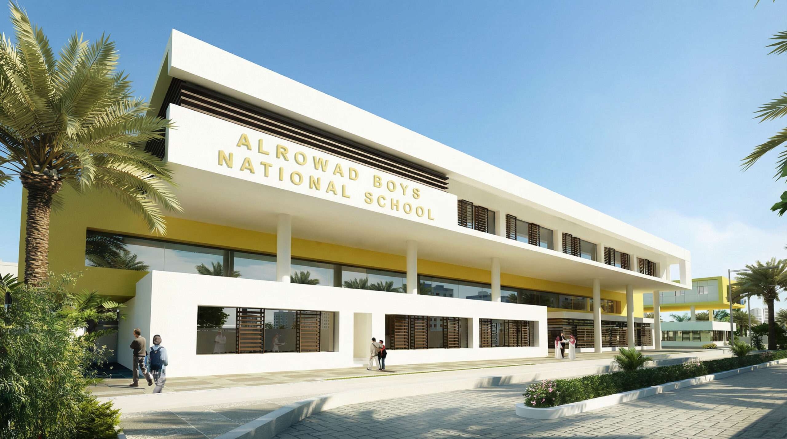 Four Schools , full grades for each with capacity of approximately 10,000 students . The educational campus layout prioritizes accessibility and efficiency, using four roads for flexible access and perpendicular entrances for student and administrative convenience. This strategic arrangement enhances the campus’s flow and structure, enhancing the experience for staff